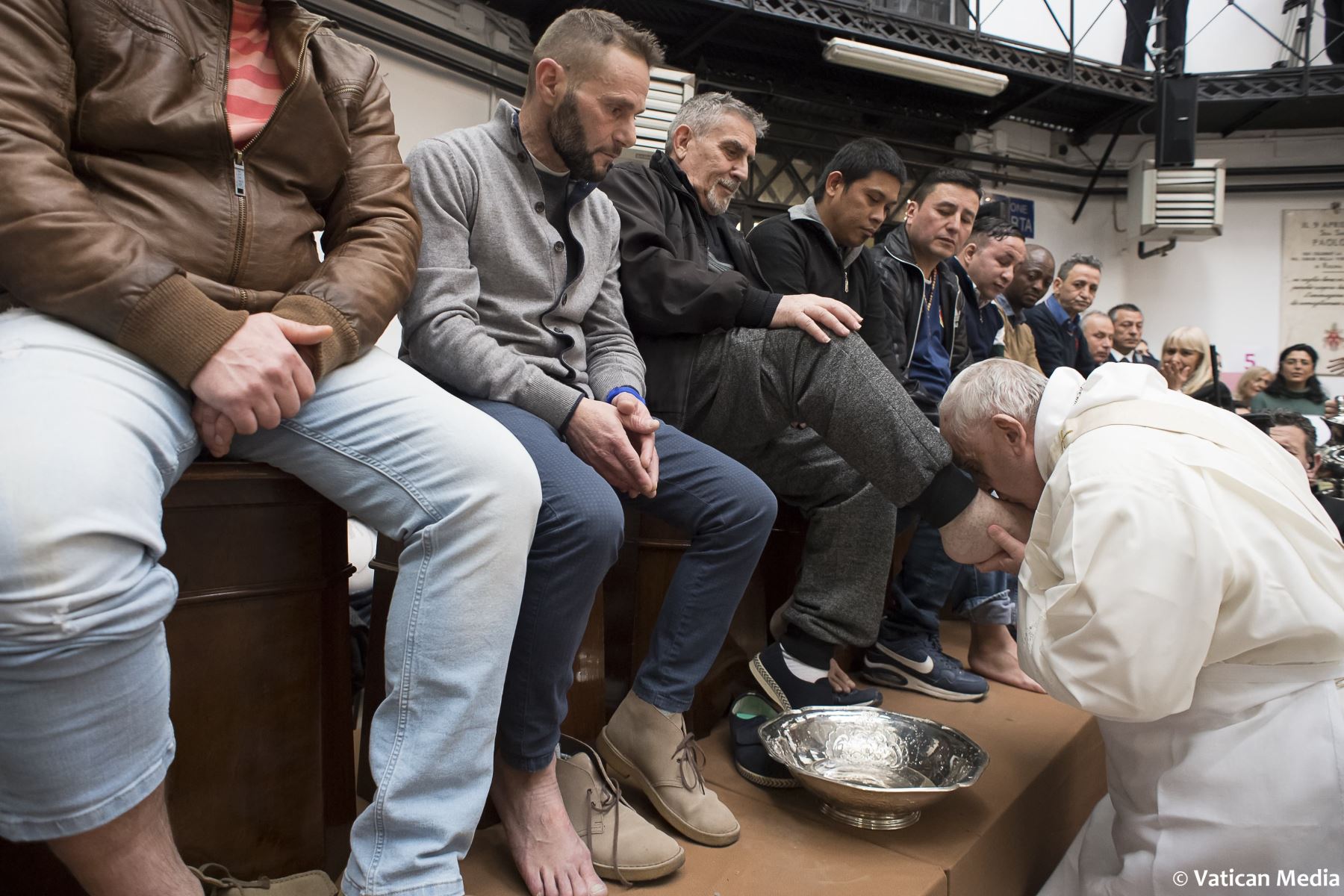 El papa Francisco, conmovido por el universo carcelario, celebró una vez más una misa del Jueves Santo en una prisión lavando los pies de doce presos, entre ellos dos musulmanes, un ortodoxo y un budista.