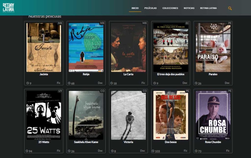Películas peruanas reconocidas internacionalmente como “Días de Santiago” de Josué Mendez, “Viaje a Tombuctú” de Rossana Díaz Costa, “La Luz en el Cerro” de Ricardo Velarde, “Rosa Chumbe” de Jonatan Relayze, “Radio Belén” de Gianfranco Annichini, “Dos besos” de Francisco Lombardi, entre otras, son parte del catálogo de Retina Latina y se viene trabajando para ofrecer mayor y diverso contenido que alimenten la plataforma.