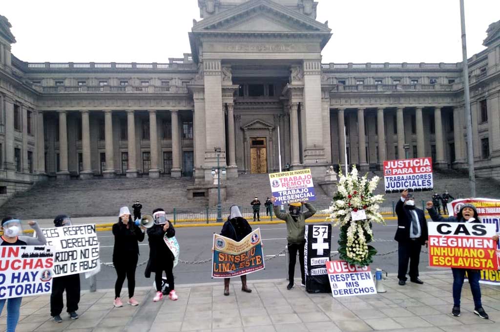 Cargando un ataúd y portando una cruz funeraria de flores, un grupo de trabajadores judiciales realizó una protesta en el frontis del Palacio de Justicia, como medida de rechazo a las disposiciones de este organismo que los obliga a restablecer las labores presenciales en las dependencias judiciales del país, con el riesgo de contraer el coronavirus, ante la falta de un adecuado sistema sanitario para enfrentar esta pandemia.